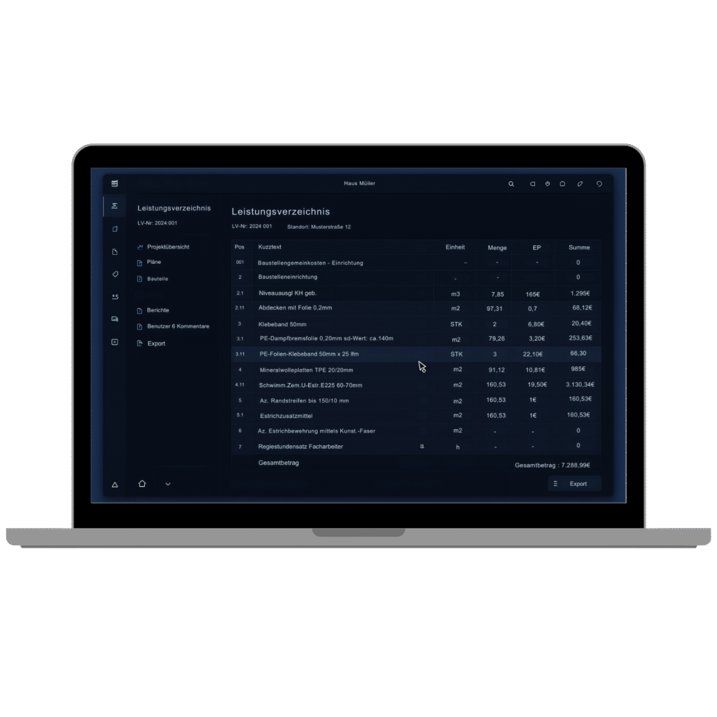 Mit nur einem Klick können Sie die Mengen als GAEB, Excel oder PDF exportieren – direkt kompatibel mit gängiger Kalkulationssoftware.